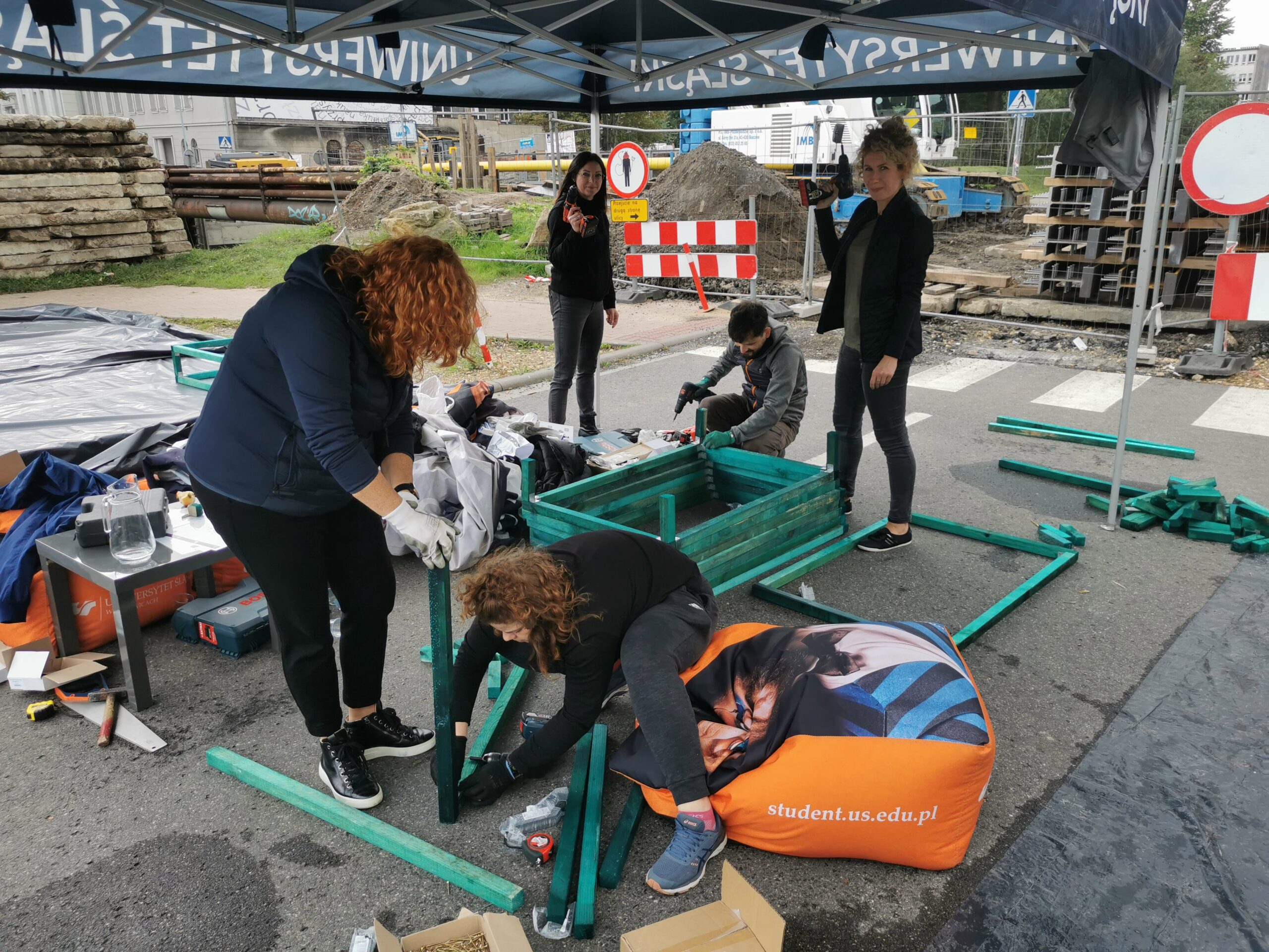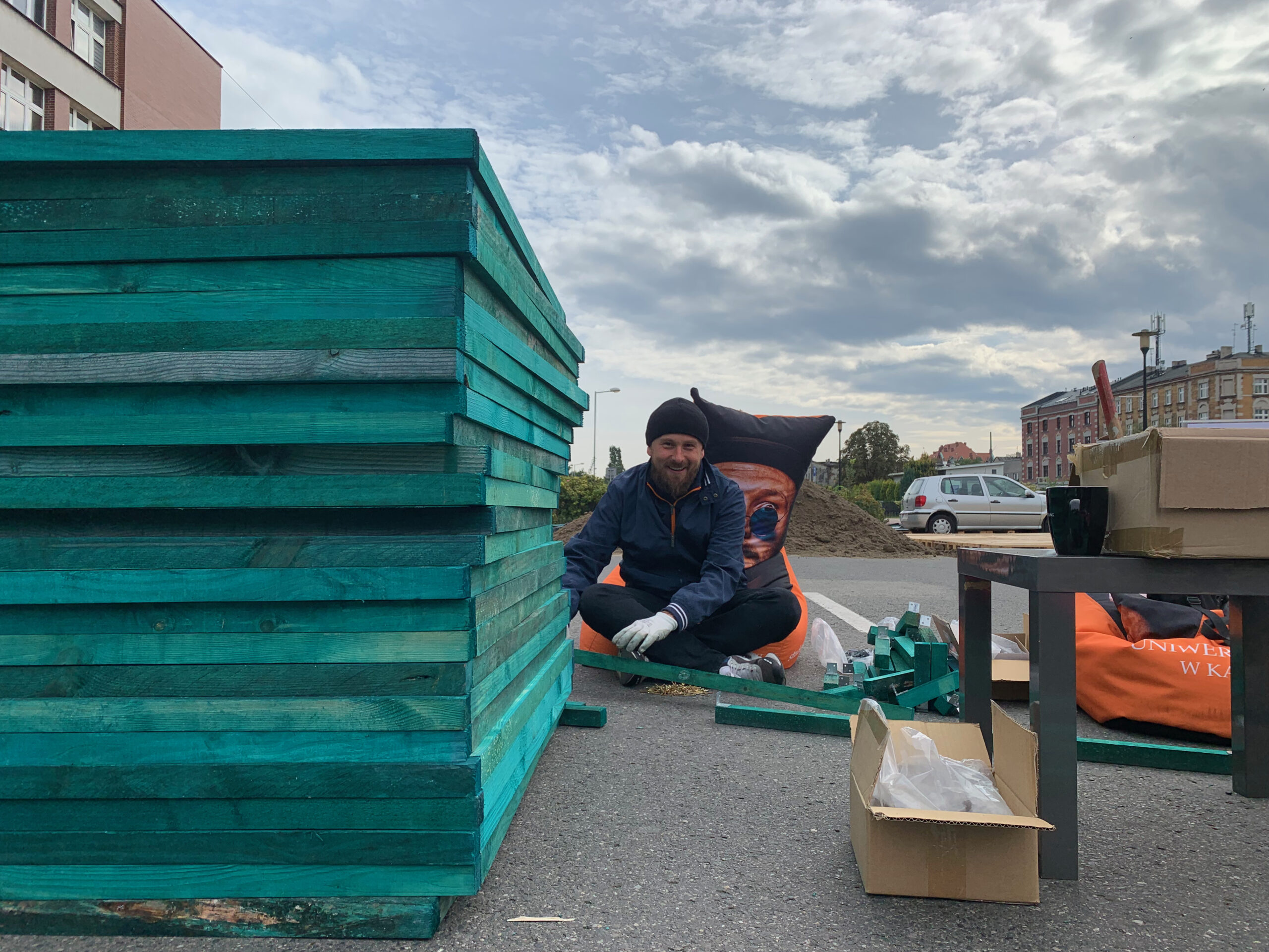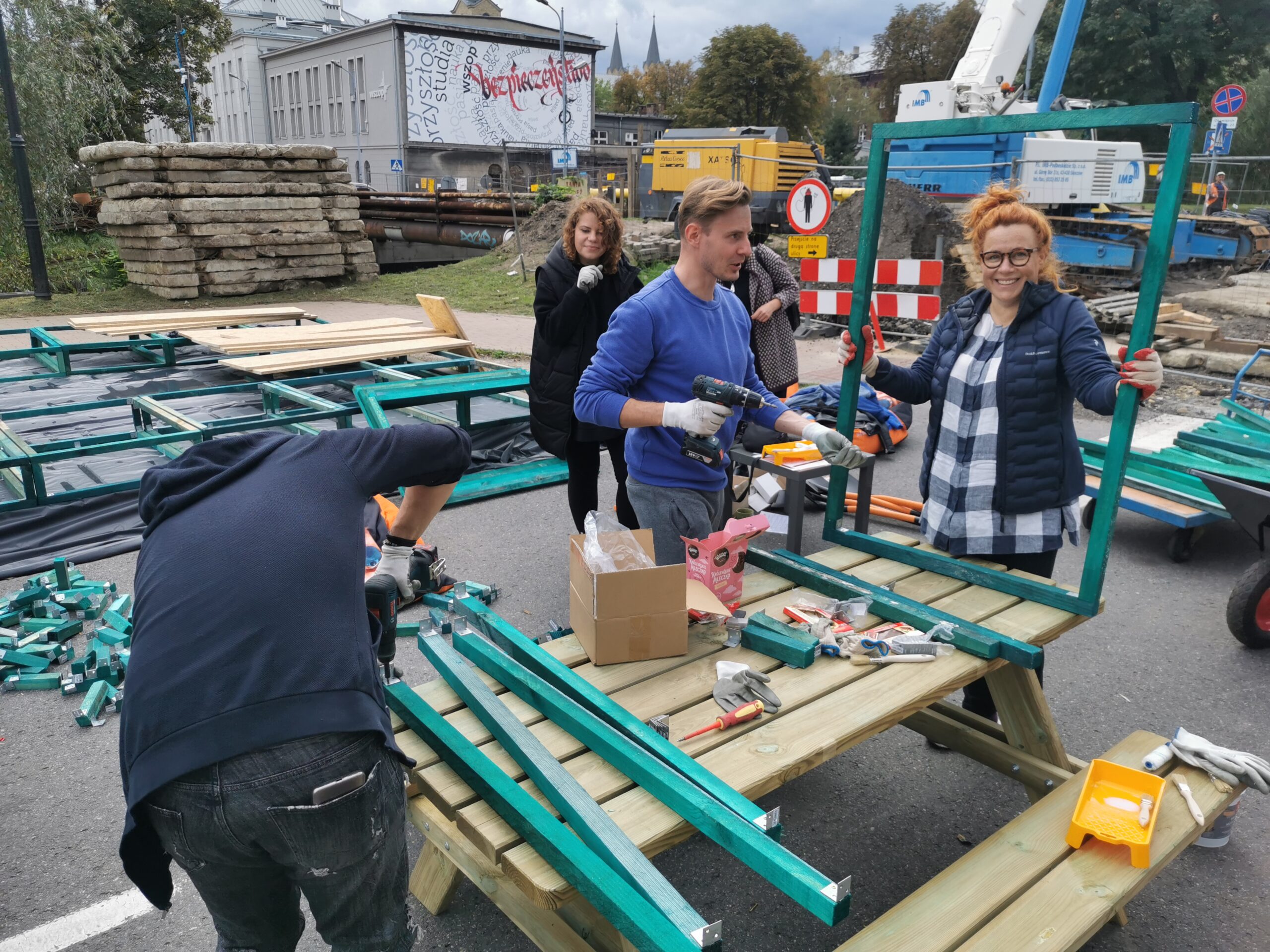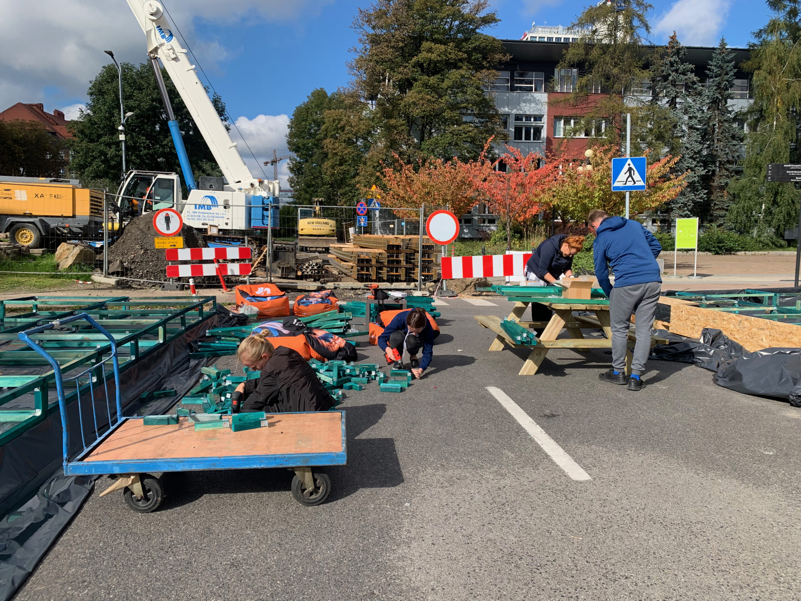 W kolejnym kroku przygotowaliśmy i zbudowaliśmy prototyp urbanistyczny zakładający zamknięcie części jezdni ul. Pańki i likwidację otaczającego ją parkingu. W jego miejscu i na deptaku przed rektoratem ustawiliśmy meble miejskie oraz społecznościowo zbudowaliśmy donice, w których później wspólnie zasadziliśmy zieleń. O tym, że ludzie związani z przekształcanym kampusem akceptują transformację, dowiedzieliśmy się dzięki wywiadom i spacerom badawczym. Jeden z obchodów był realizowany w towarzystwie osoby głuchoniewidomej, która zwracałam uwagę na kwestie ważne z perspektywy jej potrzeb. Zebrane informacje posłużyły nam do zaprogramowania koncepcji zmian docelowych oraz przygotowania instrukcji dla podobnych przekształceń mobilnościowych.